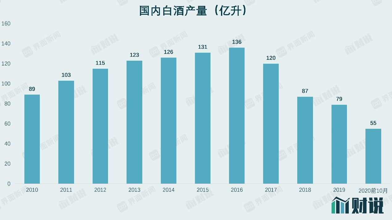 白酒行业已进入存量市场,消费升级及行业集中度不断提升带来非常明显的马太效应。近十年来,白酒行业产量处于“A”字形状态。根据WIND统计,2018年我国白酒产量为87亿升,对比2010年的89亿升,我国白酒产量在走了一个“A”形后又重新回到原点。2019年我国白酒产量则继续走低,相较2018年又下滑9.2%至79亿升。今年前10个月,白酒产量更是下滑至55亿升,相较2019年的64亿升下滑14.06%,相较2016的108亿升,更是下滑了近一半。