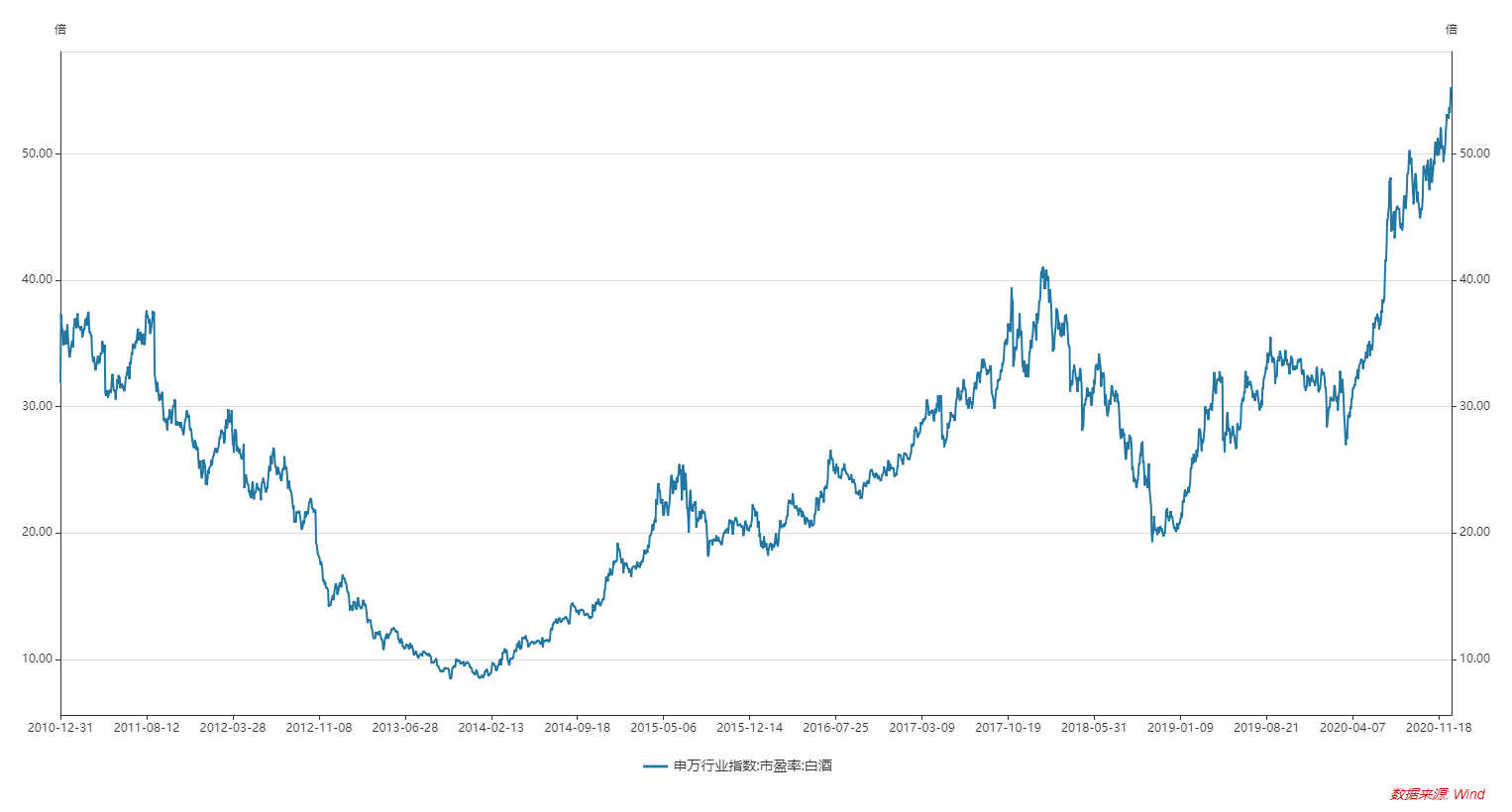 从历史数据看,目前各酒企估值都处于历史高位。以申万行业白酒市盈率为例,目前行业市盈率高达55倍,处于十年来最高值。