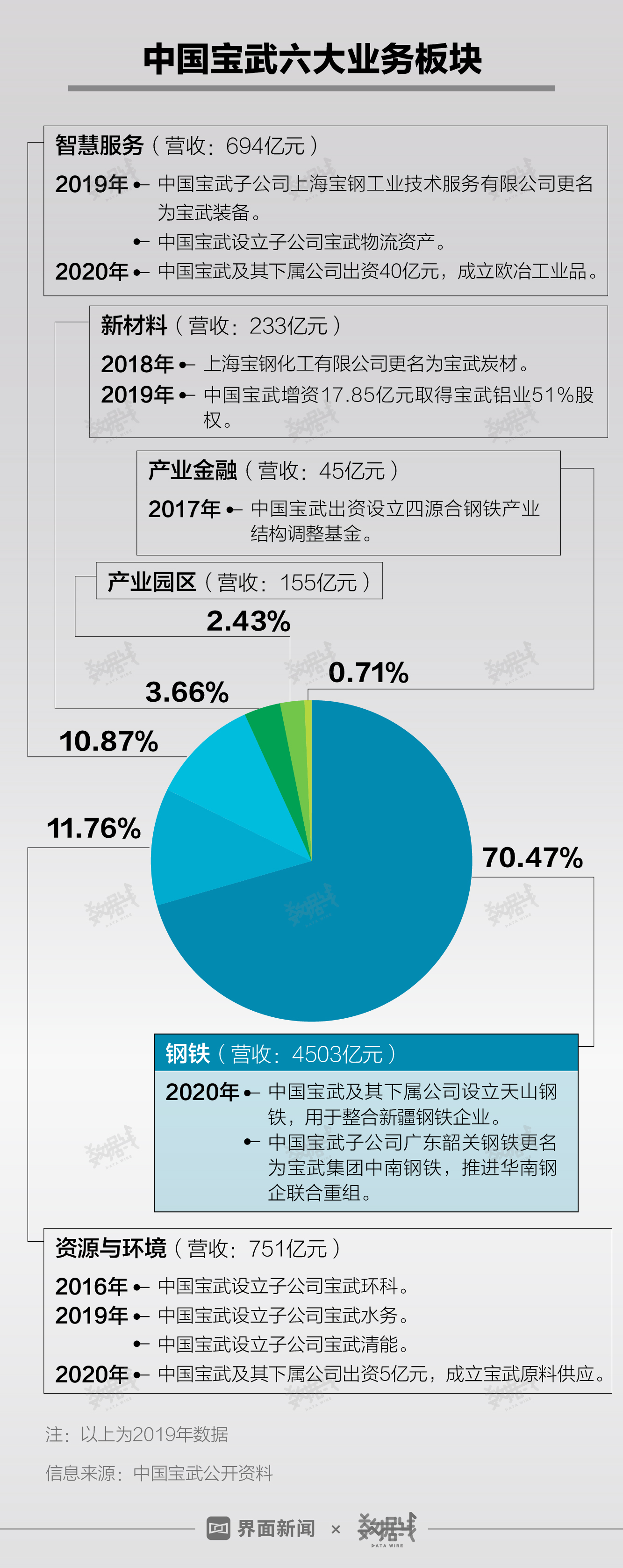 “宝武合并”后,中国宝武逐步梳理非钢资产,并将其划分为新材料、智慧服务、资源环境、产业园区和产业金融五大板块。同时,近十家集团层面的子公司先后成立,用于实现上述板块内不同业务的专业化整合。