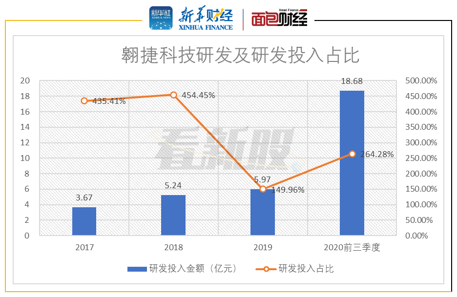 此外,公司近年来持续保持较大的研发投入。2017年、2018年、2019年、2020年前三季度的研发投入金额分别是3.67亿元、5.24亿元、5.97亿元和18.68亿元,分别占同期营业收入的435.41%、454.45%、149.96%和264.28%。