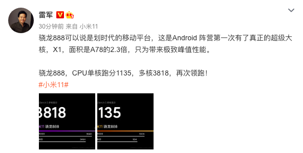 雷军公布小米11骁龙888跑分:单核1135,多核3818