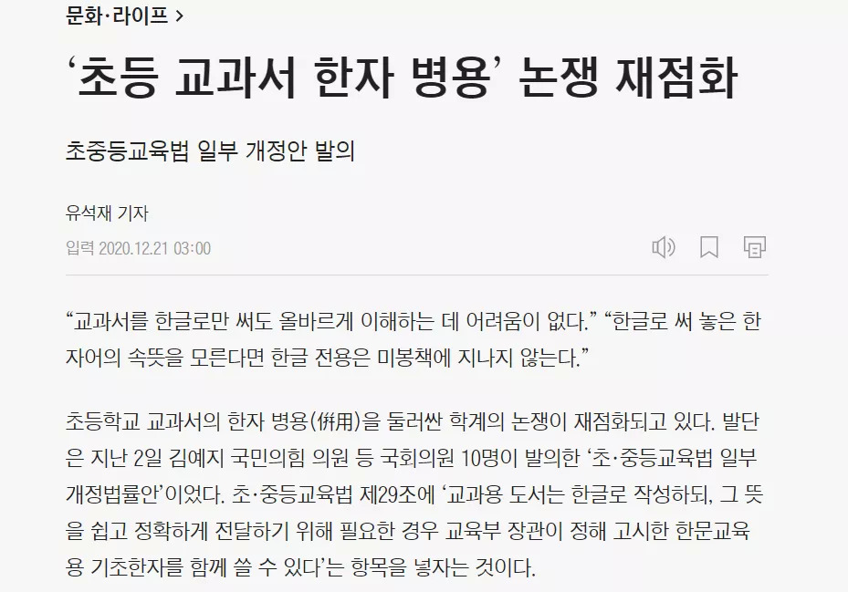 原因就是,韩国10名国会议员发起“中小学教育法修正案”,要求“教育用图书使用韩文书写,但为了更容易并明确表达含义,可以根据教育部长官的命令在教科书中同时使用汉字”。