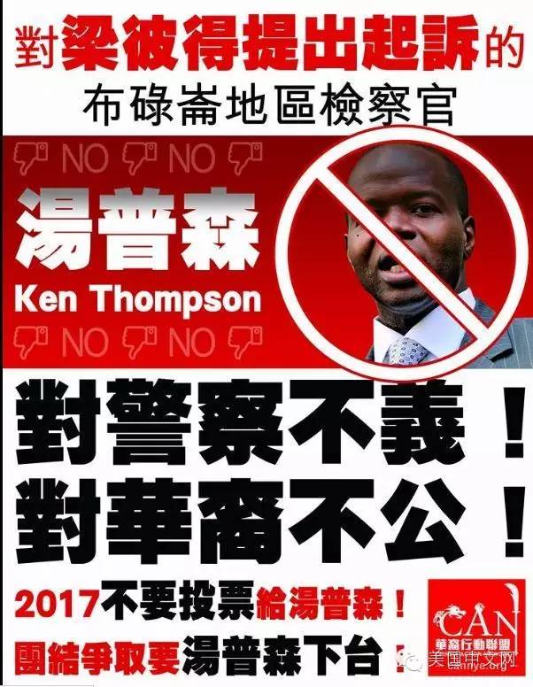 华裔警员梁彼得被定罪让华裔社区群情激愤,主流媒体,华文媒体等各种舆论都纷纷质疑检方出于政治目的,让梁彼得成为警民关系紧张、种族冲突的牺牲品,也让非裔布鲁克林地区检察官汤普森成为了众矢之的。甚至有华裔社区人士昨天在社交媒体上呼吁华人阻止汤普森在明年竞选连任。