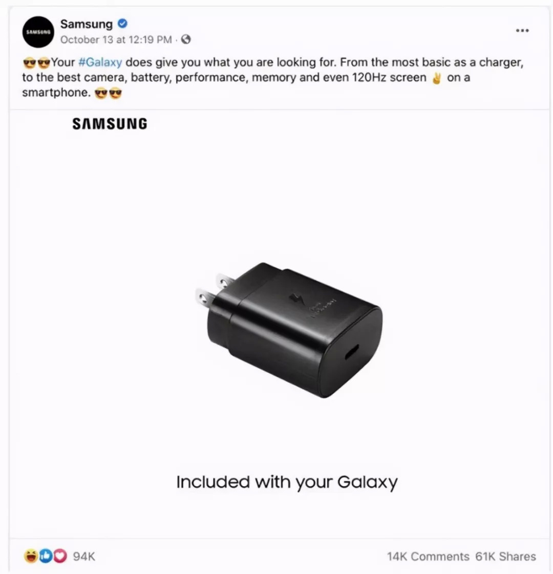 为什么说是意料之中呢,因为根据一贯的传统,往年苹果在手机方面每有大动作,三星一定会在第一时间跳出来嘲讽。如此次苹果的iPhone 12不再附赠充电器,三星官方立刻发布嘲讽推特,推特的配图是一个巨大的三星充电器,配文中得意到嚣张的墨镜黄豆人在炫耀着充电器。不过有趣的是,目前这条推特已经被删除。