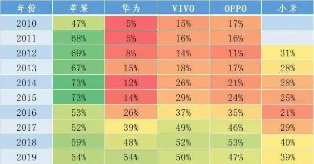 而在使用习惯和生态绑定的情况下,大多数消费者会在更换手机时,继续使用原品牌。相关统计的数据也证实了这一点。以苹果为例,常年维持在50%以上的品牌忠诚度。也就是说,有一半以上的苹果手机用户,在更换新手机时会继续选择苹果。如果旧手机还够用,谁会为新品买单呢?