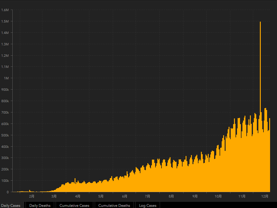 美国霍普金斯大学的疫情统计数据显示,12月22日全天,全球新增新冠肺炎确诊病例64.69万例,较上一日增加10.57万例。其中,美国新增新冠肺炎确诊病例19.5万例,较上一日增加5000例。截至目前,全球累计确诊7803万例,累计死亡172万例,累计确诊国家和地区数191个。