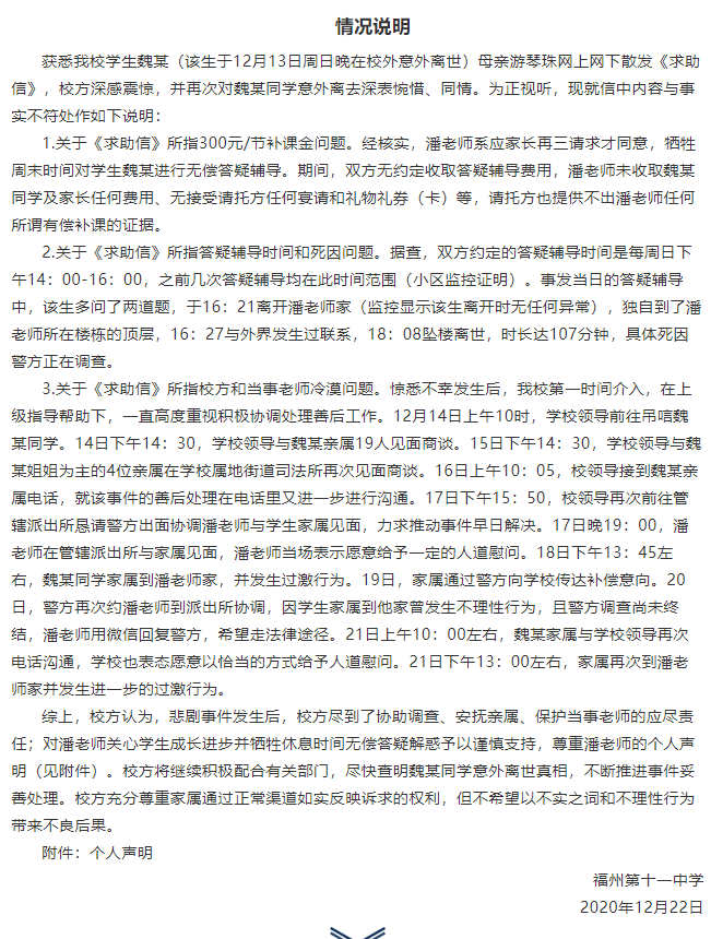 近日网传消息称,12月13日下午,福州十一中学一学生在老师家补习结束后,乘电梯至34层顶楼,在顶楼呆了两个多小时后跳楼身亡。福州第十一中学微信公众号22日发布情况说明称,获悉该校学生魏某(该生于12月13日周日晚在校外意外离世)母亲游琴珠网上网下散发《求助信》,校方深感震惊,并再次对魏某同学意外离去深表惋惜、同情。但信中内容多处与事实不符。其中关于《求助信》所指300元/节补课金问题,经核实,潘老师系应家长再三请求才同意,牺牲周末时间对学生魏某进行无偿答疑辅导。关于《求助信》所指校方和当事老师冷漠问题,学校在上级指导帮助下,一直高度重视积极协调处理善后工作。