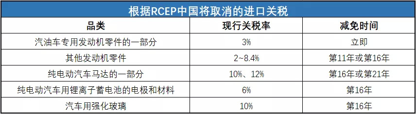 根据RCEP涉及的汽车关税中,比较重要的是日本对中国出口的汽油车发动机零部件中的一部分,立即从现行的3%关税降低为零,而其他相对比较重要的零部件则要在第11年或第16年逐步取消,这部分进口关税为2~8.4%。