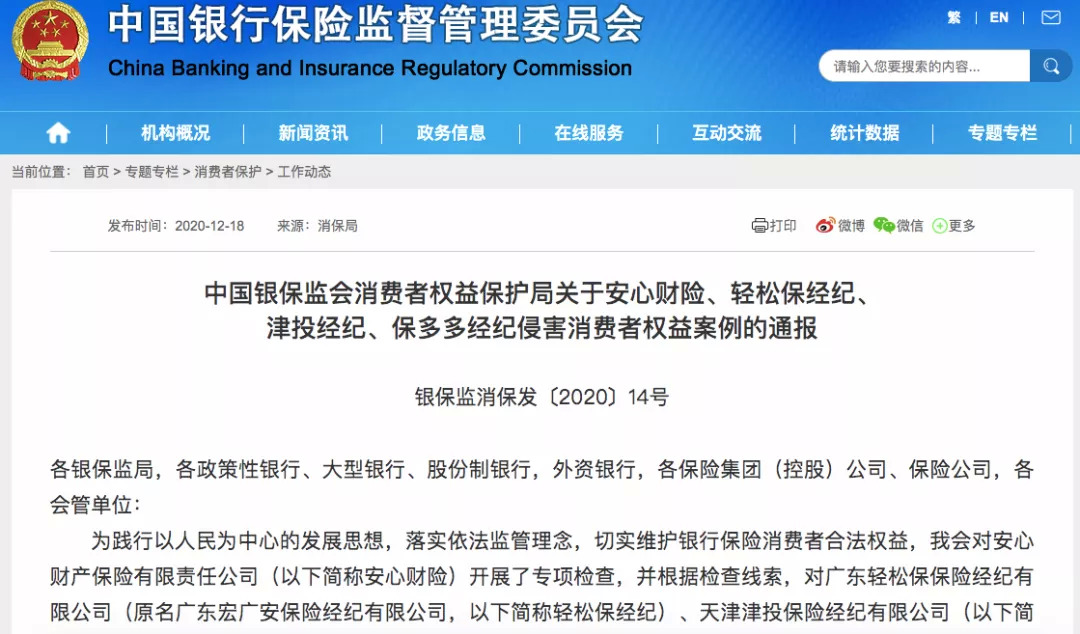 12月18日,银保监会消费者权益保护局发布的通报显示,广东轻松保保险经纪有限公司(原名广东宏广安保险经纪有限公司,以下简称轻松保经纪)、保多多保险经纪有限公司(以下简称保多多经纪,今年9月21日已更名为水滴保险经纪有限公司)等4家机构在宣传销售短期健康险产品中,存在“首月0元”“首月0.1元”等不实宣传(实际是将首月保费均摊至后期保费),或首月多收保费等问题。上述行为涉嫌违反《保险法》中“未按照规定使用经批准或者备案的保险条款、保险费率”“欺骗投保人”等相关规定。