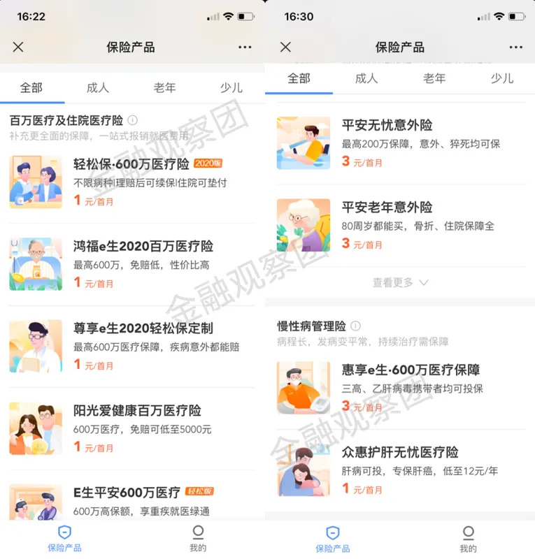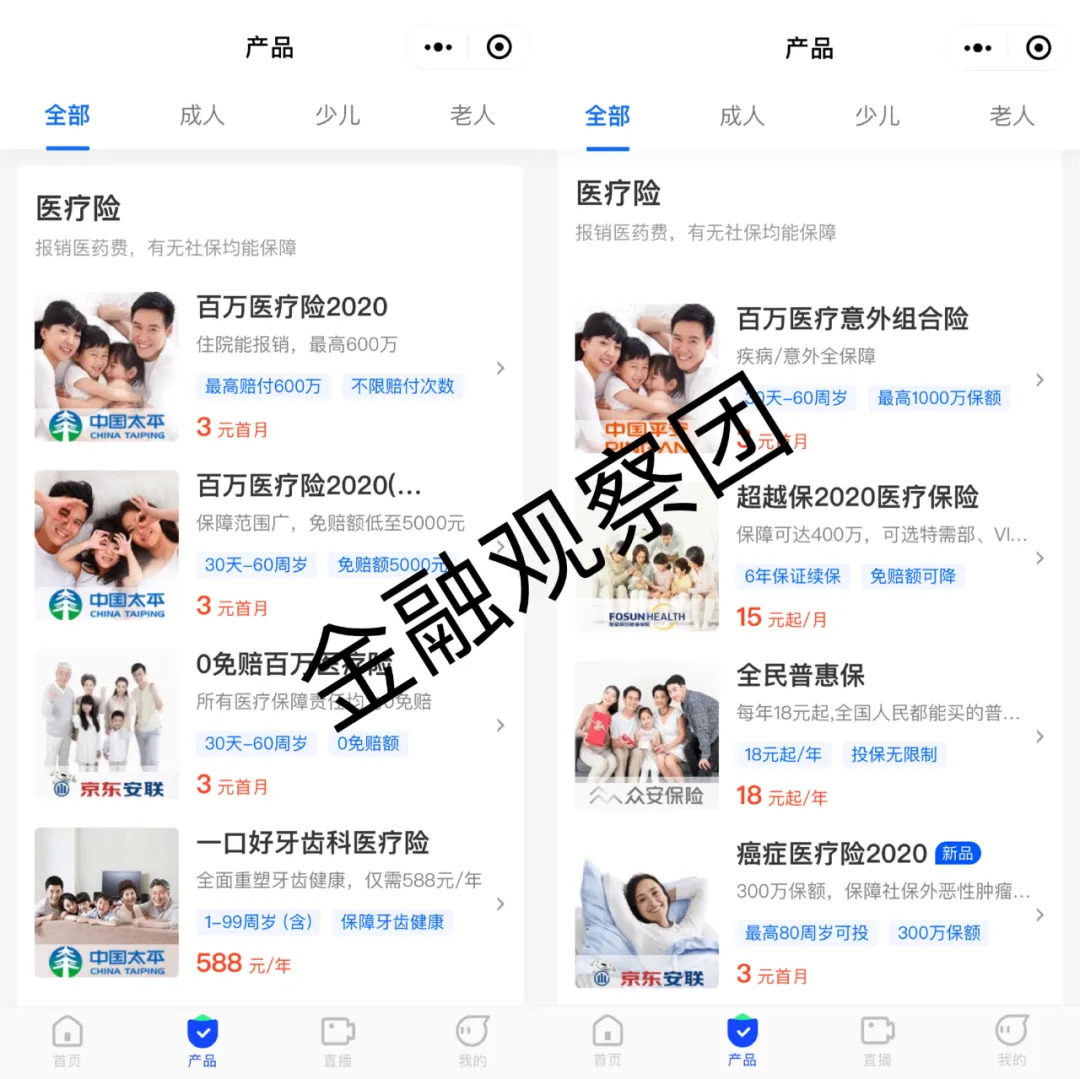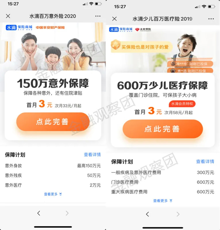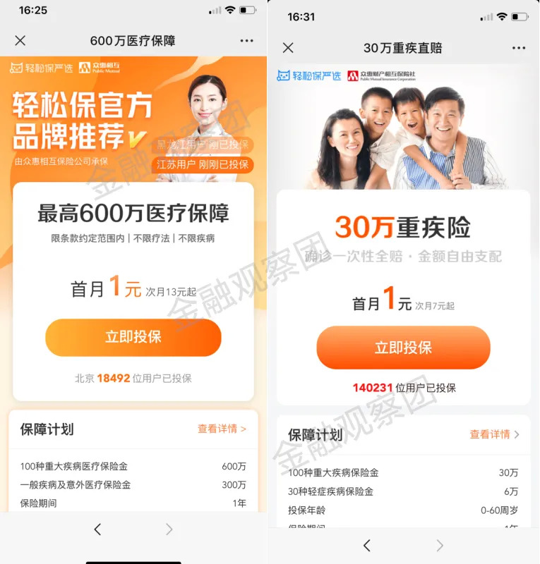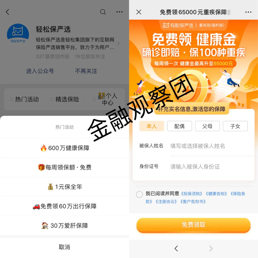 答案是否定的。今日,金融观察团在水滴保险商城、轻松保险商城上发现,多个保险产品仍以“免费领取”、“首月1元”、“首月3元”为“噱头”吸引投保人。