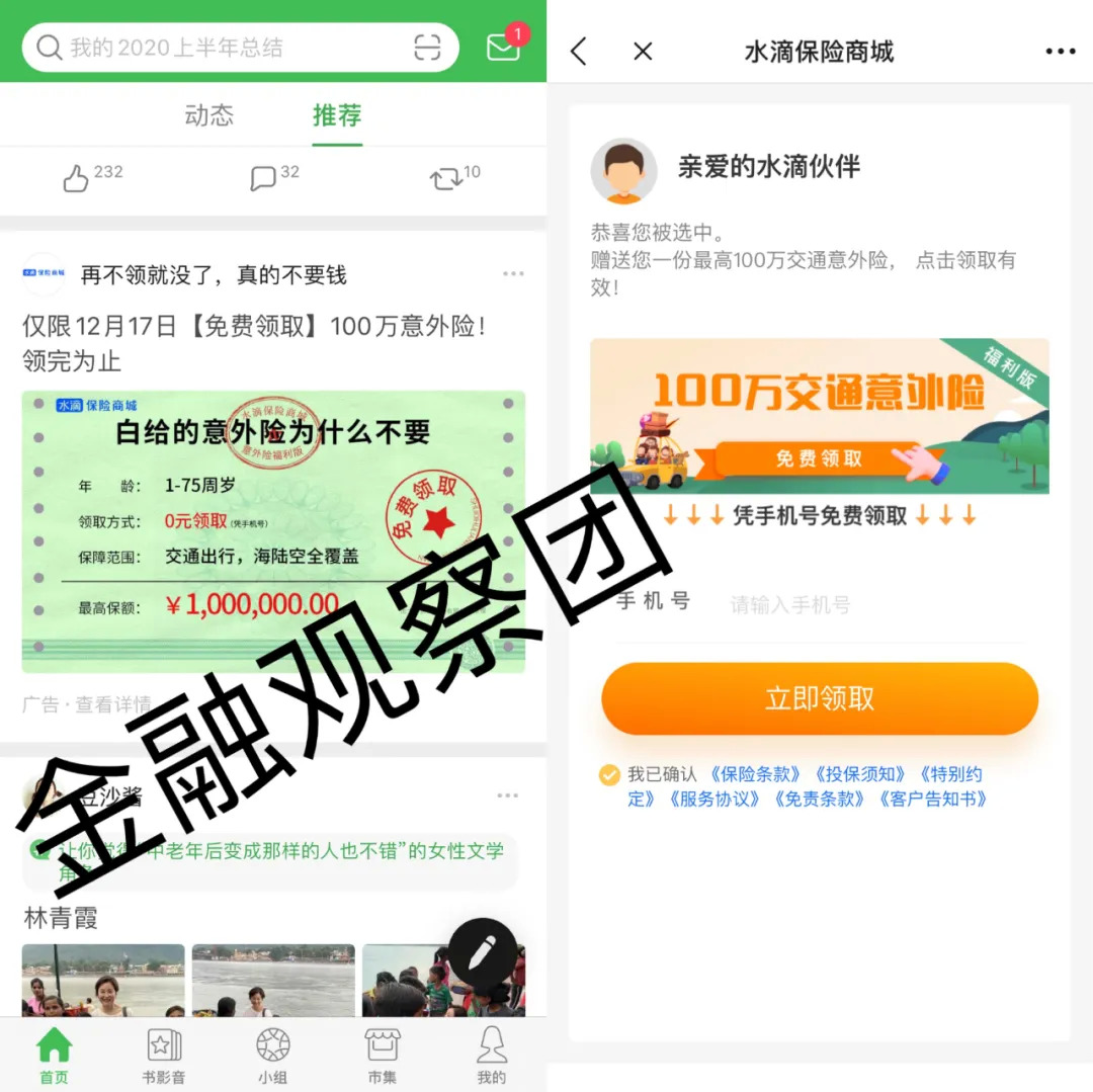 不仅如此。在被银保监会点名的前一日,也就是2020年12月17日,金融观察团还在豆瓣上刷到了水滴保险的“免费”广告。