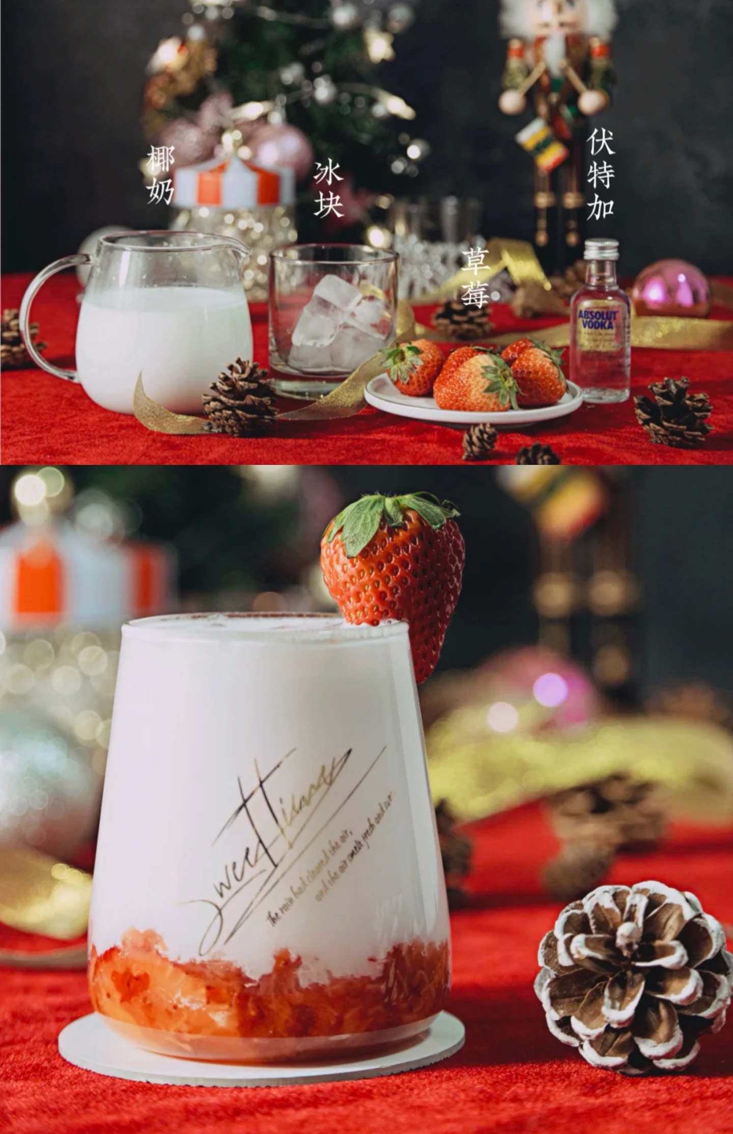 融合了椰奶与伏特加的特别口味,和酸甜草莓相得益彰,在家就能轻松享受。小红书博主@不爱喝水的玄小姐介绍称,喝前搅拌均匀,椰汁和草莓的结合,使圣诞的浪漫气息更加浓厚。
