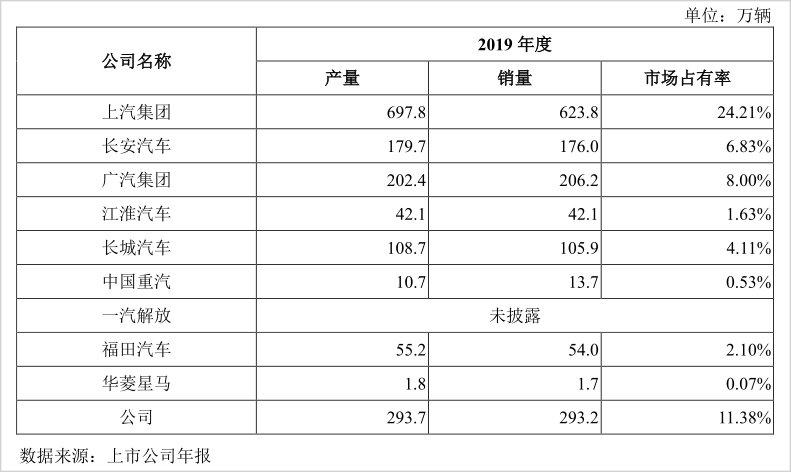 实际上,上交所主板上市的东风汽车乃是东风集团旗下主要从事轻型商用车和柴油发动机业务的公司,而东风集团业务还包含重中卡车、乘用车及汽车金融等业务。2019年,东风集团成员企业整车产量293.7万辆,销量293.2万辆,市场占有率为11.38%,位列A股整车行业可比公司第二位。如果将一汽集团(未上市)计算在内,则属于国内第三大车企。