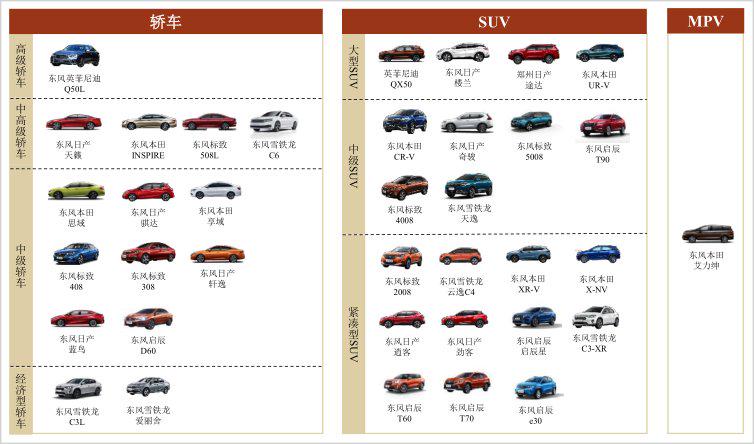 截至目前,东风集团成员企业主要生产和销售47种乘用车车型,包括21种轿车、24种SUV和2种MPV车型系列。其中,自主品牌仅有6种轿车、3种SUV和1种MPV车型系列,且基本属于低档的经济性车型。