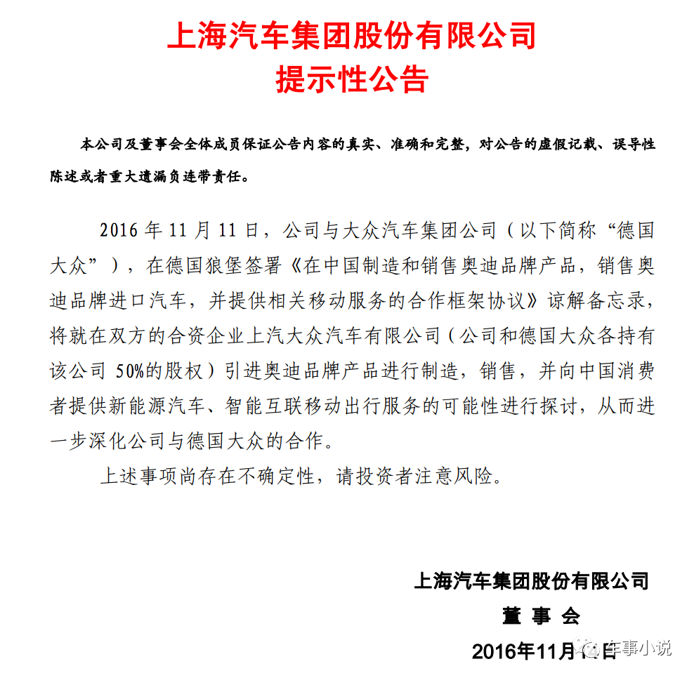 2016年11月14日,上汽集团发布公告称,该公司已经在11月11日与大众汽车集团公司(以下简称“德国大众”),在德国狼堡签署《在中国制造和销售奥迪品牌产品,销售奥迪品牌进口汽车,并提供相关移动服务的合作框架协议》谅解备忘录。