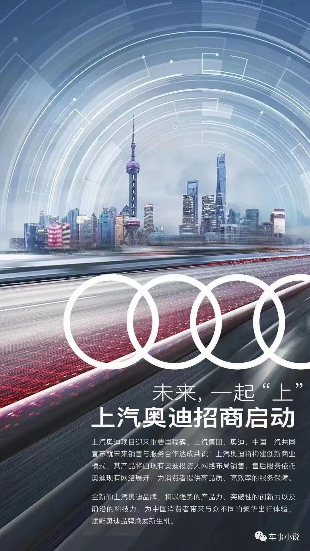 就在三方联合声明发布过后,上汽奥迪一张招商海报第一时间紧跟着现身网端。在这则招商海报中表述,“上汽奥迪将构建创新商业模式”,具体哪种创新并未展开说明。此外,也明确了上汽奥迪“产品由现有奥迪投资人网络布局销售,售后服务依托奥迪现有网络展开”。