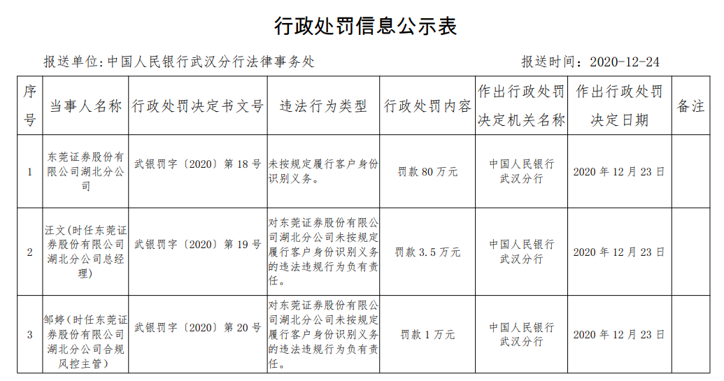 12月24日,央行武汉分行行政处罚信息公示表显示,东莞证券股份有限公司湖北分公司因未按规定履行客户身份识别义务被罚80万元。东莞证券股份有限公司湖北分公司总经理汪文及合规风控主管邹婷因对公司未按规定履行客户身份识别义务的违法违规行为负有责任,分别被罚3.5万元和1万元。