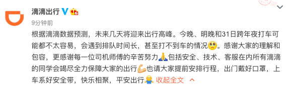 滴滴出行:未来几天将迎出行高峰