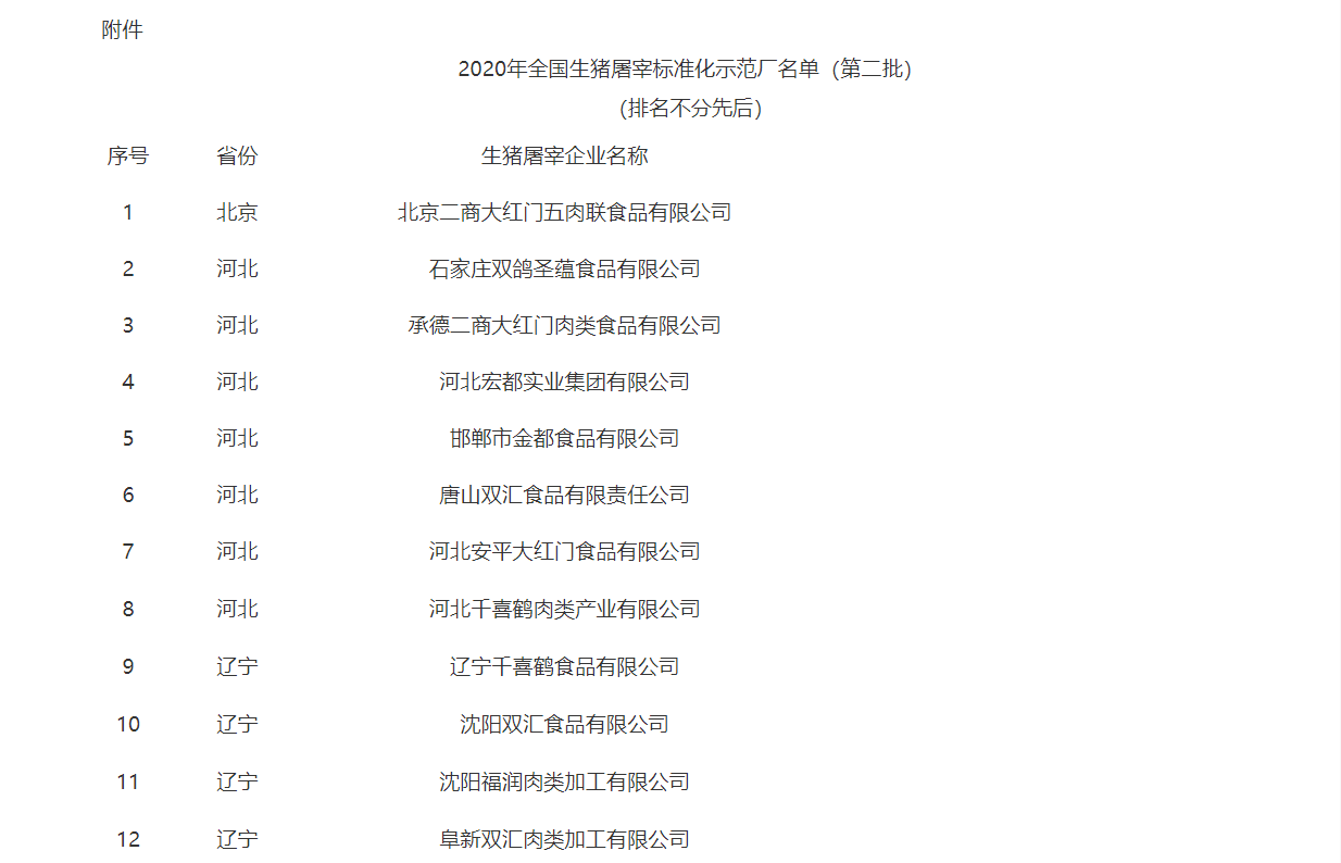 12月24日,农业农村部网站发布《农业农村部办公厅关于公布2020年全国生猪屠宰标准化示范厂名单(第二批)的通知》。