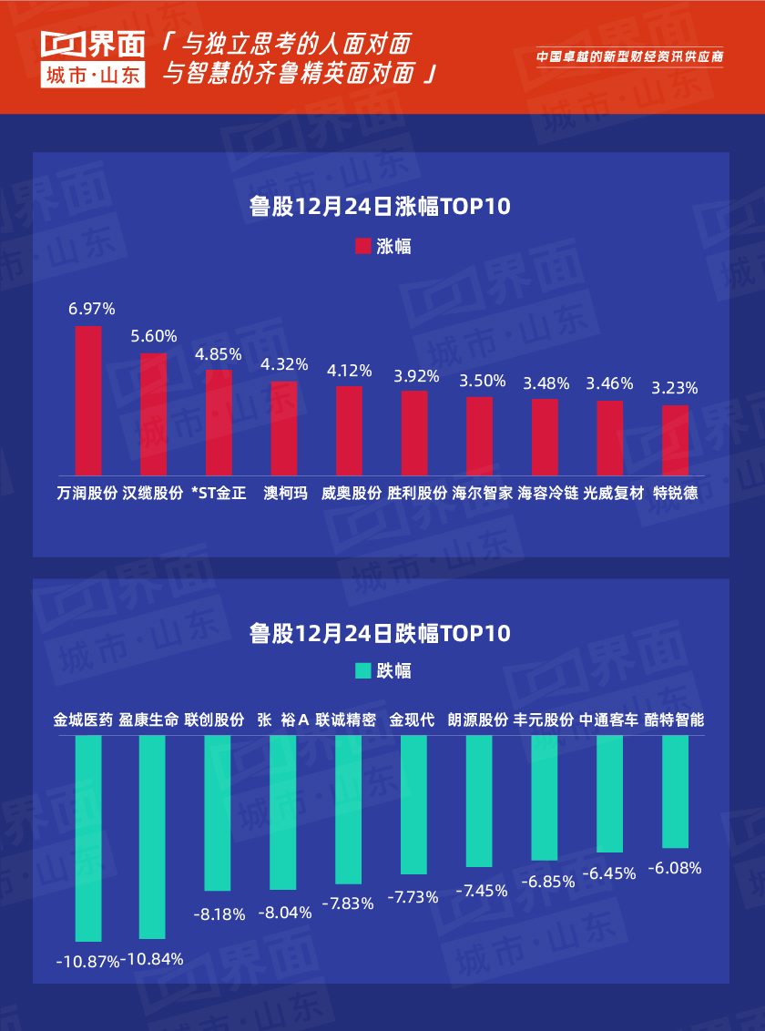 受大盘影响,12月24日,山东省内沪深股票38只个股上涨,183只股下跌,2股持平。