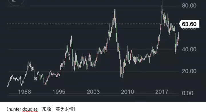 下图自1985年以来hunter douglas的股价走势图,从波段的投资策略来看,这是一家非常优秀的企业,而从长期持有的角度来看,这家企业则容易使投资人陷入深深的焦虑之中。