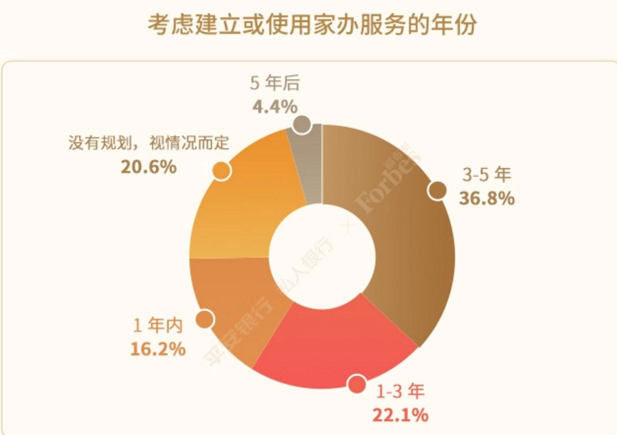 调研发现,20.9%的被调研者已使用家族办公室服务,没有使用的主要原因是了解较少,其次是担心安全和隐私问题。其中,有64.2% 的被调研者有兴趣进一步了解家族办公室。同时,超七成被调研者表示,未来1-5年内考虑使用家族办公室服务。