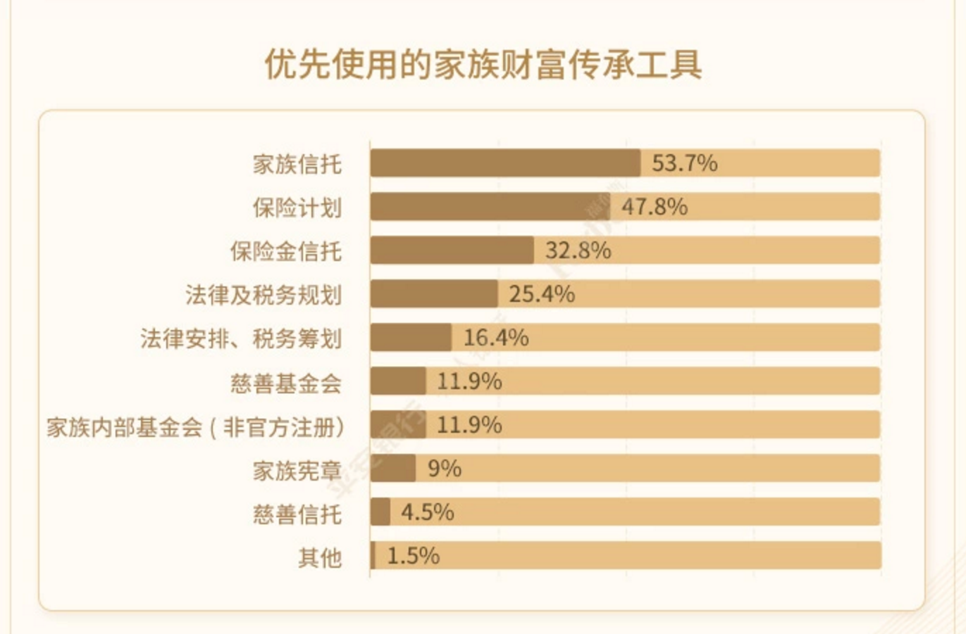 而对拥有不同家族资产体量的参与者调研发现,家族信托再次成为其心中首选的家族财富传承工具(20亿人民币以上53.8%、10亿至20亿人民币50%、1亿至10亿元人民币53.7%)。