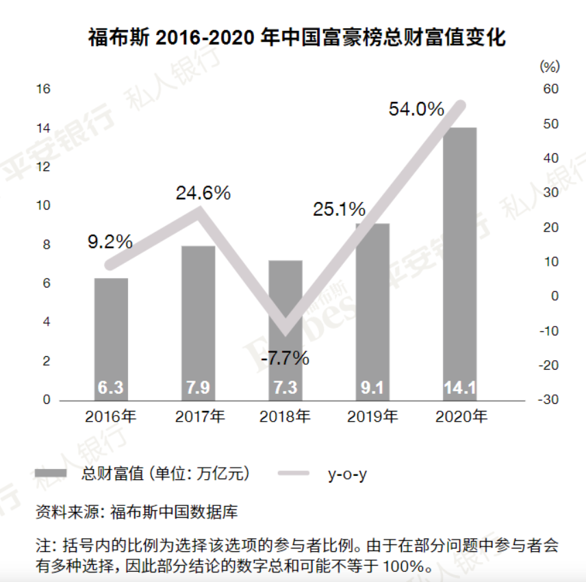白皮书显示,2020年福布斯中国富豪榜上榜者的总财富值由一年前的9.1万亿人民币飙升至14.1万亿人民币,近三分之二的上榜者的财富在过去一年时间有所上涨。同时,今年的上榜门槛为15.5亿美元(约110亿人民币),一年前为10亿美元(约71亿人民币)。