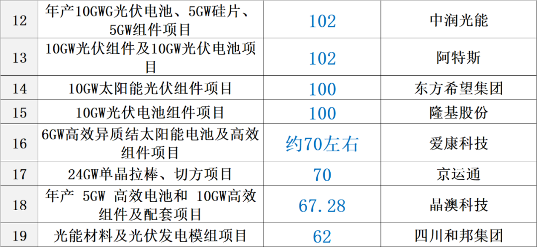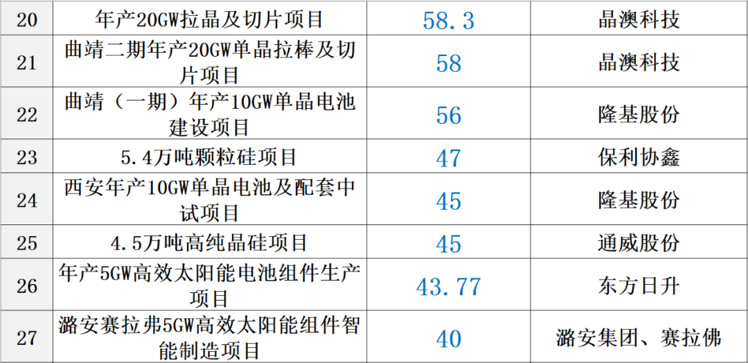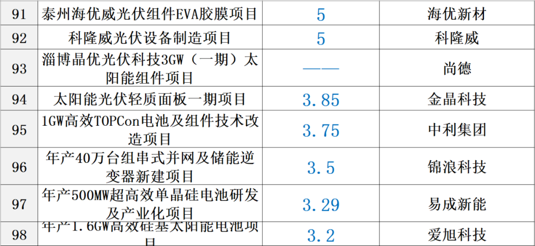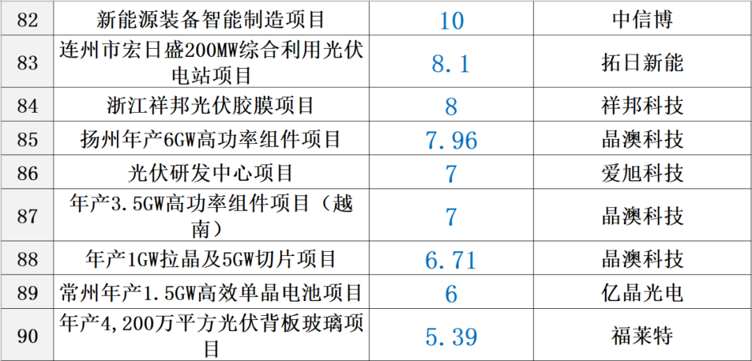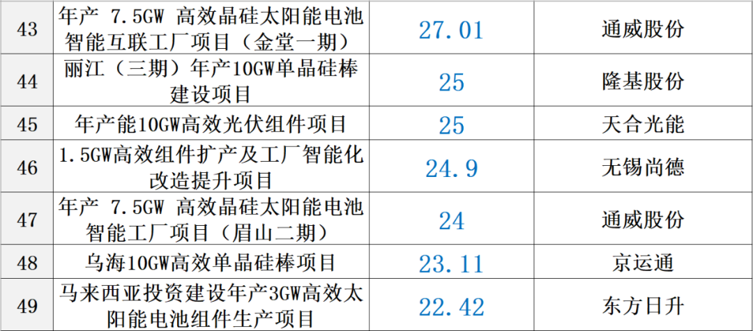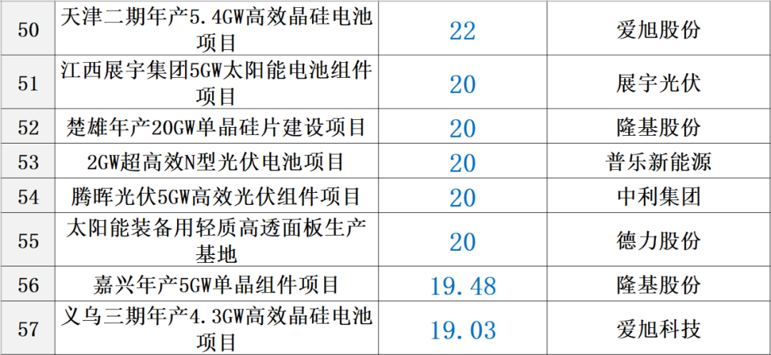 其中,单个项目投资额在10亿元以上的就多达82个,50亿元以上的有22个,100亿元以上也有15个,前三大投资项目投资预算都在200亿元以上,第一是东方日升的“15GW 高效电池+15GW高效组件项目”,投资预算达206亿元;其次是通威股份“投资建设年产30GW高效太阳能电池及配套项目”,以及爱旭股份“义乌年产36GW高效太阳能电池及配套项目”,两大项目投资预算均为200亿元。