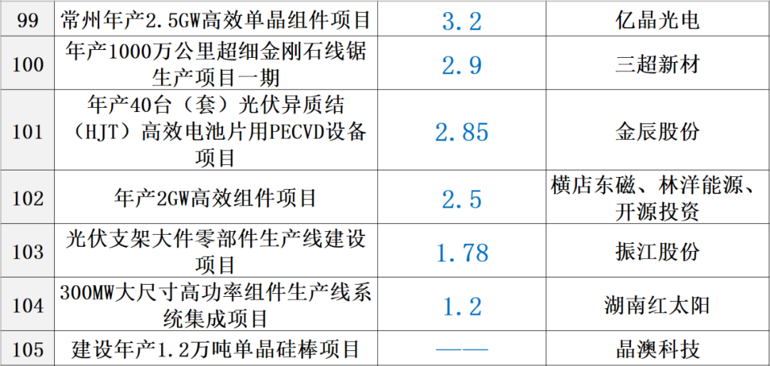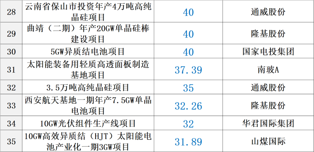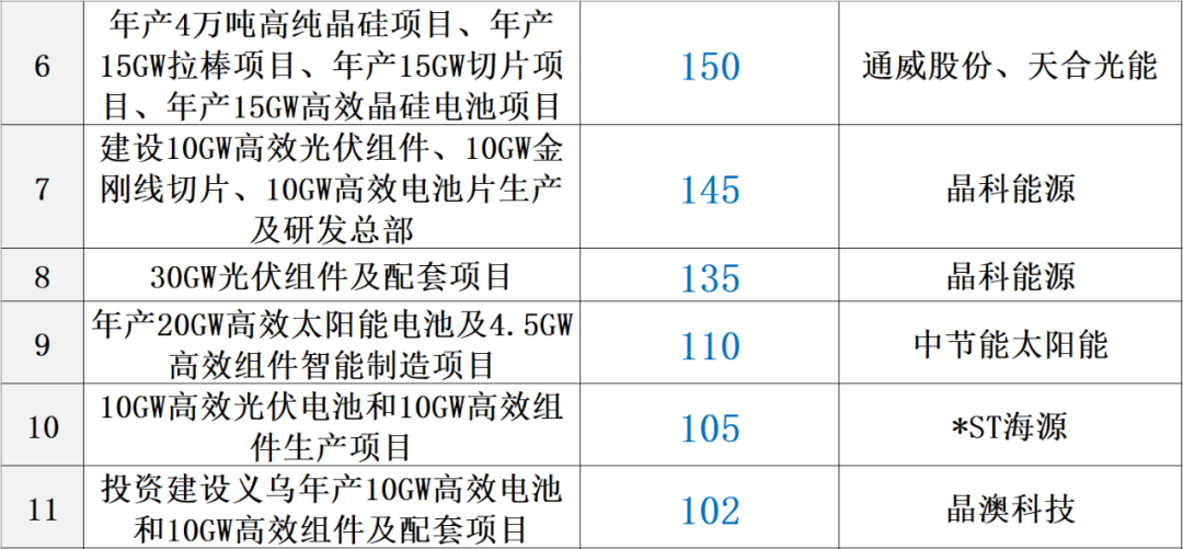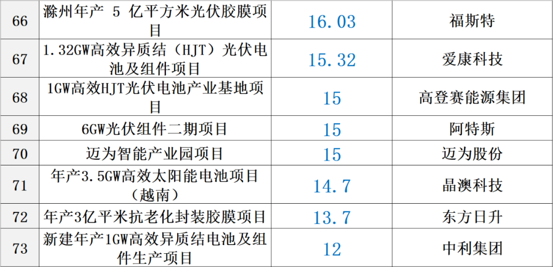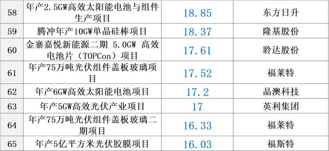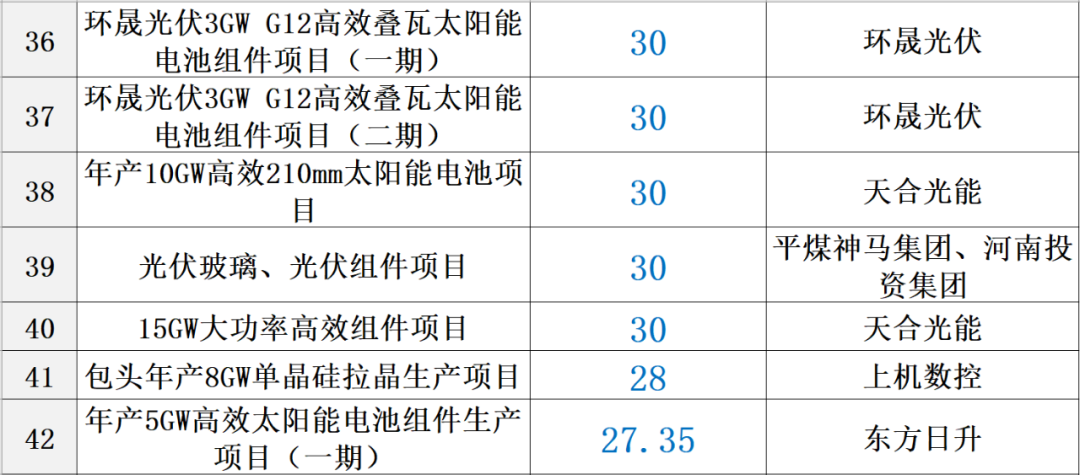 其中,单个项目投资额在10亿元以上的就多达82个,50亿元以上的有22个,100亿元以上也有15个,前三大投资项目投资预算都在200亿元以上,第一是东方日升的“15GW 高效电池+15GW高效组件项目”,投资预算达206亿元;其次是通威股份“投资建设年产30GW高效太阳能电池及配套项目”,以及爱旭股份“义乌年产36GW高效太阳能电池及配套项目”,两大项目投资预算均为200亿元。