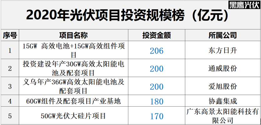 2020年除了老牌巨头在凶猛布局外,前十大光伏投资项目中还出现了新面孔,比如第五名的广东高景太阳能科技有限公司的“50GW光伏大硅片项目”,该项目计划投资170亿元;还有*ST海源的“10GW高效光伏电池和10GW高效组件生产项目”,项目投资预算为105亿元。
