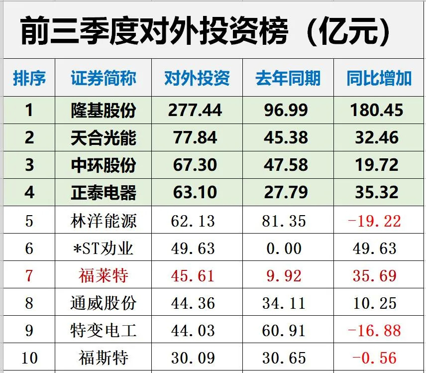 其中,65家企业对外投资规模超1亿元,30家超10亿元,隆基股份以277.44亿元的投资规模高居榜单第一位。