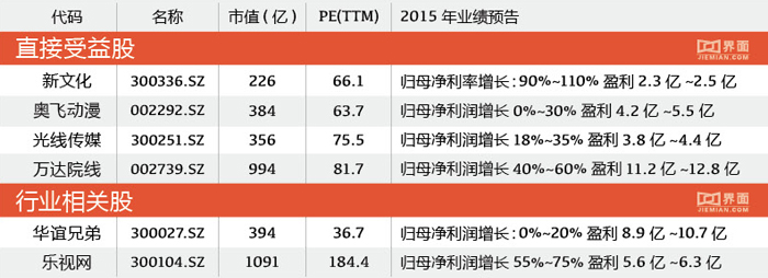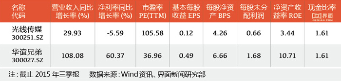 结合两家公司业绩来看,投资者给予光线传媒的估值显然更高:华谊兄弟预计2015年度净利润同比上升0%-20%,约为8.9亿-10.7亿左右,2015年预计市盈率为36.7倍;而光线传媒2015年度净利润同比上升18%-35%,约为3.8亿-4.4亿,市盈率约为75.5倍。