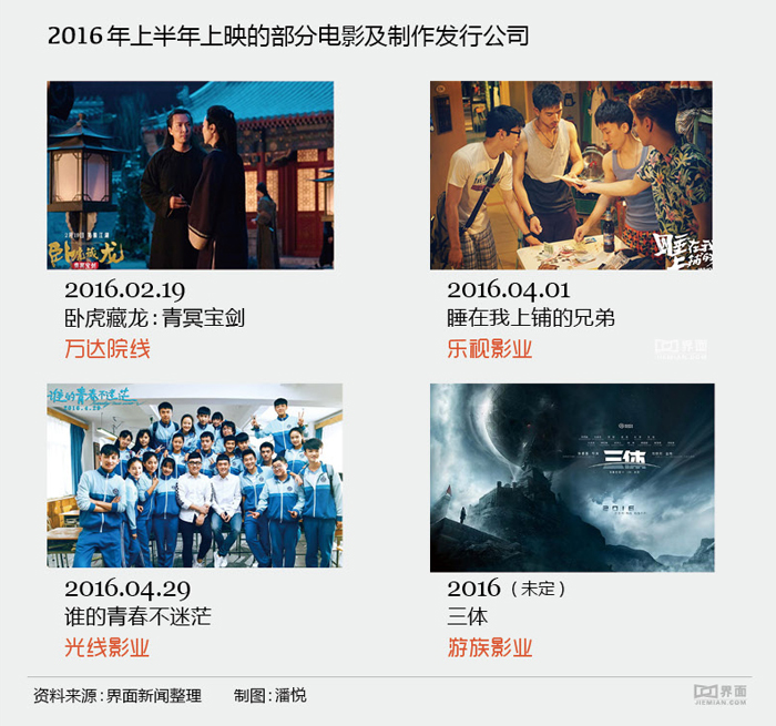 电影市场经过2015年国产剧的爆发式票房,2016年发展势头正盛,对于顶级IP的挖掘需求依然存在。界面新闻初步整理了2016年上半年预计上映的电影,其中受关注度较高的《睡在我上铺的兄弟》、《谁的青春不迷茫》参与出品发行的分别为乐视影业和光线传媒,万达院线(002739.SZ)参与的五洲电影发行公司则参与发行了《卧虎藏龙:青冥宝剑》。备受关注的大IP《三体》的电影版也预计将在2016年上映,出品方则是游族影业,与游族网络(002174.SZ)有紧密的联系。