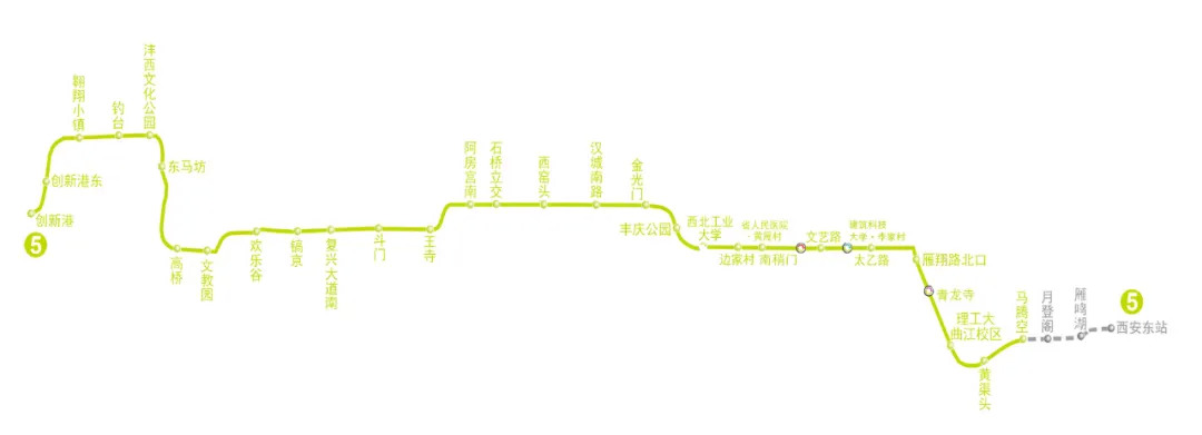5号线是西安市轨道交通线网中第二条东西走向的主骨架线路,该线路西起创新港,东至西安东站,全长45.26公里,共设车站34座。受国铁西安东站建设整体方案影响,先期计划开通马腾空站至创新港站,含车站31座,共计41.6公里。一期贯穿主城区并连接西咸新区,沿线分布着多所高等院校、科研机构,同时分布有唐长安西市遗址、小雁塔、唐长安城遗址、青龙寺等,是一条既串联了核心科教文化,又能反映大唐盛景的地铁线路。二期横贯西咸新区沣东新城、沣西新城,线路以高架为主, 连接交大创新港、西工大翱翔小镇、西咸国际文化教育园、丝绸之路风情城、欢乐谷等一批重大项目,有力支撑了西咸新区新兴产业聚集,对推进新区高质量发展,加快西咸一体化进程具有积极作用。