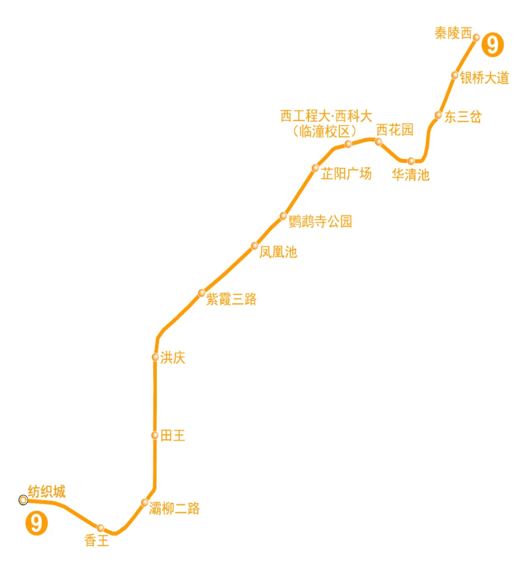 9号线纺织城站首末班车发车时间为6:30、22:00;秦陵西站首末班车发车时间为6:30、22:30,全天运营服务时间16小时42分钟。