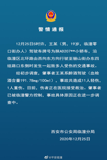 据西安@平安临潼 微博消息,12月25日5时许,王某(男,19岁,临潼零口街办人)驾驶车牌号为陕AD207**小轿车,沿临潼区北环路由西向东方向行驶至骊山街办东四组路口东侧时发生一起致多人受伤的交通事故。经初步调查,肇事者王某系醉酒驾驶(血检酒含量191.78mg/100ml),事故共造成11人轻伤,1人重伤。目前,伤者正在医院接受救治。肇事者已被临潼警方控制,事故具体原因正在进一步调查中。