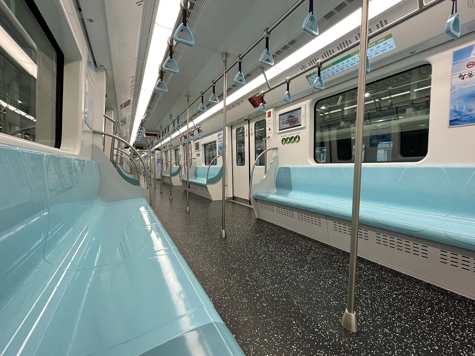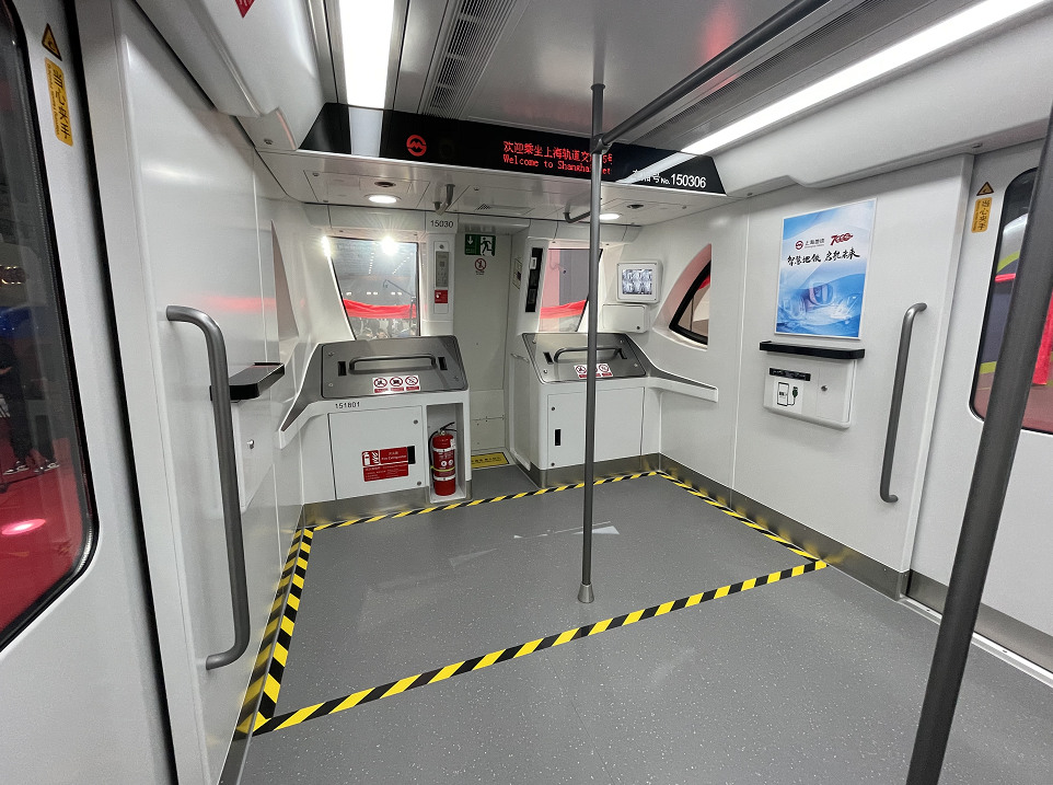 在建中的上海轨道交通14号线是上海地铁除1号线、2号线以外的又一条8节编组A型车线路,同样采用全自动驾驶(GOA4)技术。线路西起嘉定封浜,东至浦东桂桥路,贯穿市中心,是连接上海东西部的一条轨道交通“大动脉”。2019年9月10日,上海地铁14号线首列新车抵沪。该项目列车共计49列。全新开放式司机室的设计,相比于一般6节编组的列车,单列车载客量可增加800余人。内装设计简约大气并搭配了“孔雀蓝”色调。