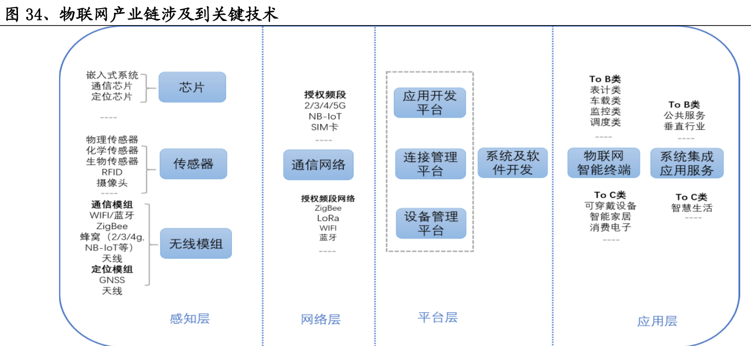 在物联网产业链中,可分为感知层、网络层、平台层和应用层。物联网建设的初期,感知层和网络层更为优先,因为这是万物连接的第一步。芯片、传感器和无线模组是感知层的主要组成部分。在技术壁垒上,芯片和传感器更高,通信模组稍低。