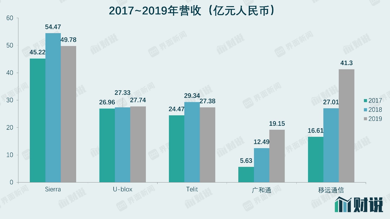 以国内两大通信模组龙头厂商为例。广和通(300638.SZ)过去三年的营收分别为5.63亿元、12.49亿元和19.15亿元,移远通信(603236.SH)过去三年的营收分别为16.61亿元、27.01亿元、41.3亿元,呈现爆发式增长的态势,逐渐抢夺了三大国际厂商的市场份额。