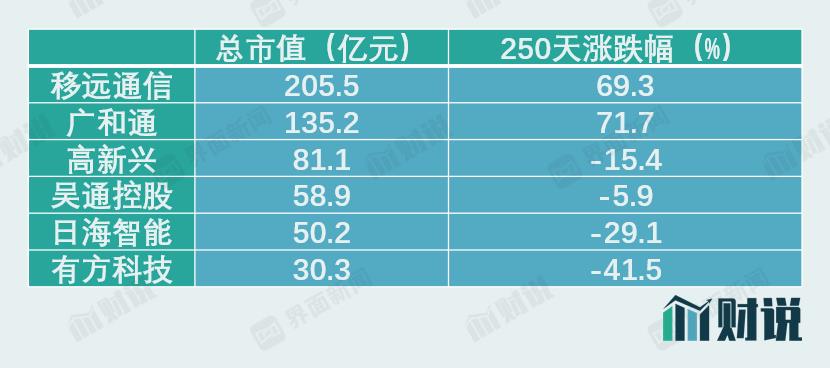 从股价走势看,通信模组公司分化较为严重,移远通信和广和通近一年涨幅分别为69.3%和71.7%,维持较强走势,市值在百亿元以上;有方科技、日海智能、吴通控股三家公司近一年市值进一步缩水,有逐步被边缘化的趋势。这也是通信模组行业激烈竞争优胜劣汰的结果。
