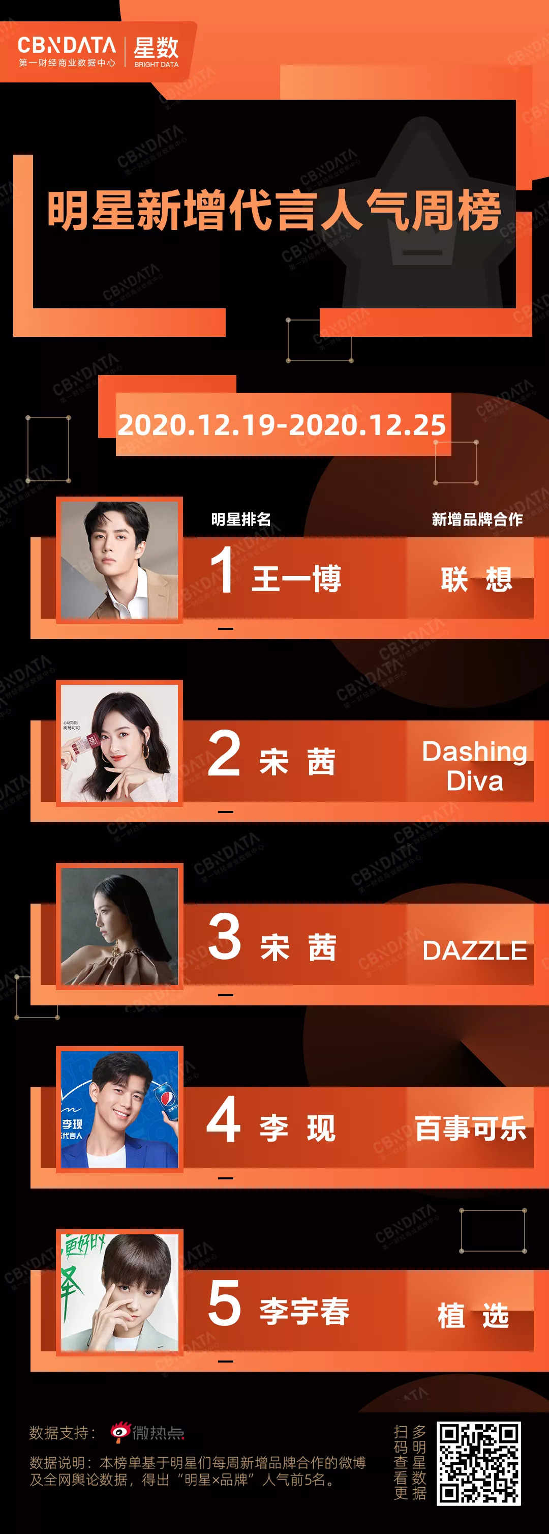 CBNData星数全新发布“明星新增代言人气周榜”及“明星代言周报”,聚焦美妆个护、食品饮料、家电3C、服饰鞋包、日化家清五大品类。