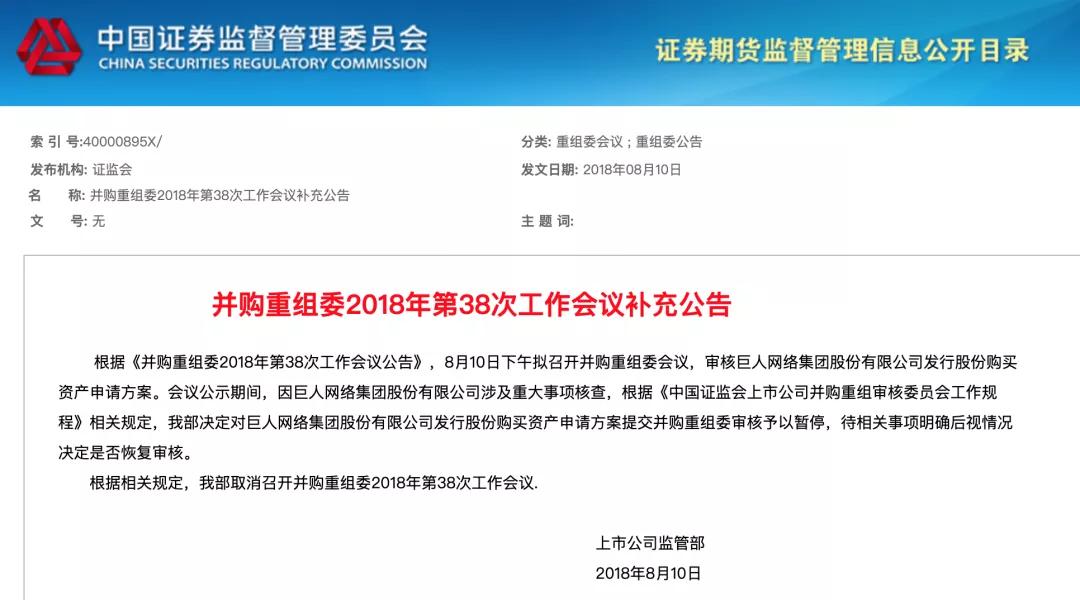 2018年8月10日,证监会发布公告表示,因巨人网络涉及重大事项检查,其收购Playtika项目将被予以暂停,待相关事项明确后视情况而定是否恢复审核。