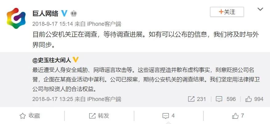 一个多月后,史玉柱发了一条令外界意外并震惊的微博:“最近遭受人身安全威胁、网络谣言攻击等。这些谣言捏造并散布虚构事实,刻意贬损公司名誉,企图在某商业活动中谋利。”