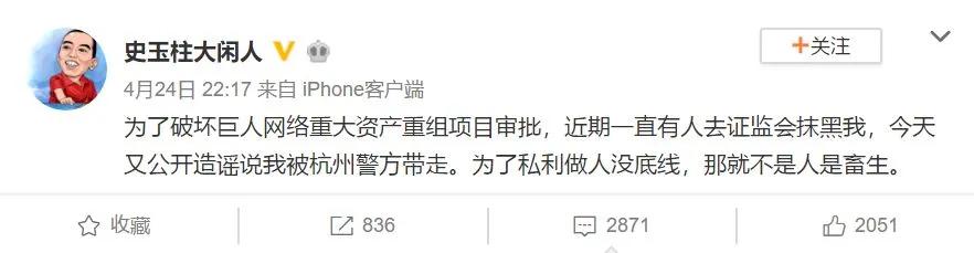 当时,史玉柱官方微博也发了一条微博回应称,“为了破坏巨人网络重大资产重组项目审批,近期一直有人去证监会抹黑我,今天又公开造谣说我被杭州警方带走。”