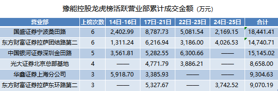 界面新闻统计发现,参与程度最深的有三家营业部,分别为国盛证券宁波桑田路、东方财富证券拉萨团结路第二和中国银河证券深圳金田路,三家营业部在豫能控股的累积成交量分别为1.84亿元、1.47亿元和1.51亿元。