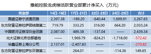 此外,在豫能控股上同样操作较为活跃的营业部还有光大证券北京总部基地、华鑫证券上海分公司、东方财富证券拉萨东环路第二,上榜次数分别为4次、3次和3次。前二者在边拉高边出货,累积已净卖出572.42万元和270.82万元,东方财富证券拉萨东环路第二累积小幅净买入149.65万元。