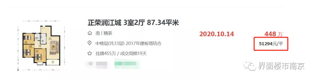 江北核心区作为目前南京最热门的板块之一,在售新房限价约3.1万-3.3万/㎡;而区域内二手房,据链家网显示,正荣润江城有一套小户型房源成交价高达51294元/㎡,再次刷新了区域二手房价的天花板。