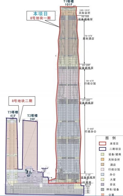 据网络曝光的资料来看,绿地468总建筑面积23.1万平米,一楼作为大堂层,建筑面积为1400平米。5-46层建筑面积为11.67万平米,主要为超高层办公用房。50-67层建筑面积为4.0万平米,主要为CEO行政公馆,共80套。70-97层建筑面积为4.92万平米,主要为星际酒店,包括332个房间、中餐厅及全日餐厅。100-101层建筑面积约0.31万平米,为绿地468天际会所,设意大利餐厅及观景平台。