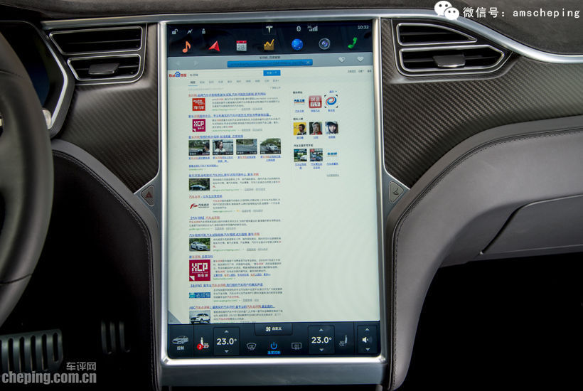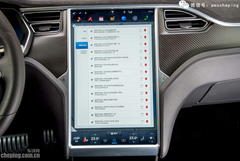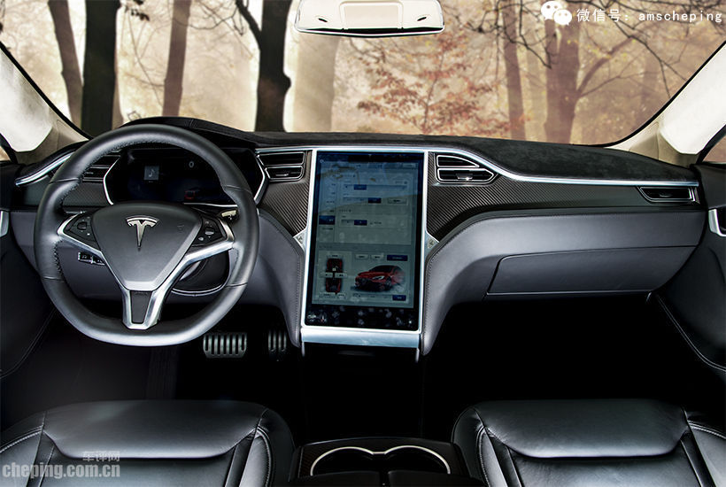 P90D与一般电动车型并无不同,挡把和车窗按键均来自奔驰,驾驶非常简单。内饰方面最大的亮点为17英寸的超大号触摸屏,此外只有双闪开关和手套箱开关为物理按键。触摸屏内提供媒体、摄像头、电量、日历、导航、车辆控制等多个界面,并提供联通3G信号供上网使用。